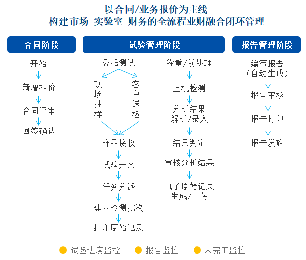 • 檢測業(yè)務(wù)信息化:可覆蓋實驗室從合同審批、委托下單、樣品管理、資源調(diào)度、檢測記錄、報告管理、財務(wù)開票結(jié)算等全業(yè)務(wù)的過程管理。支持通過手機、平板、二維碼、RFID、移動支付、全電票等技術(shù)提升管理效率;
