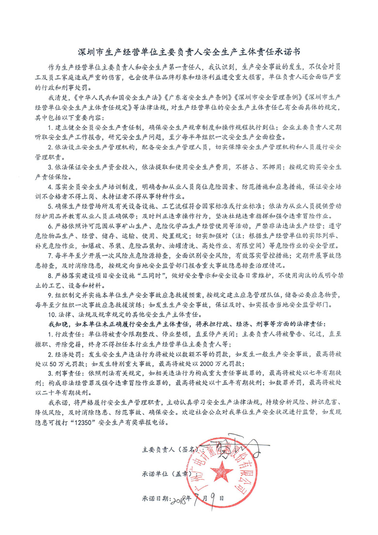 深圳市生產(chǎn)經(jīng)營(yíng)單位主要負(fù)責(zé)人安全生產(chǎn)主體責(zé)任承諾書(shū)