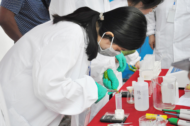 輪到市民王阿姨時,只見她從菜籃里拿出一根尖椒遞給技術人員,技術人員立刻開始了檢測——先把尖椒切碎放到三角瓶中,加入磷酸緩沖溶液,振蕩,過濾……一系列熟練精準的操作看得大家連聲稱贊。最后把處理完的試劑放入農藥殘留檢測儀,結果很快顯現出來:抑制率小于50%,檢測合格。
