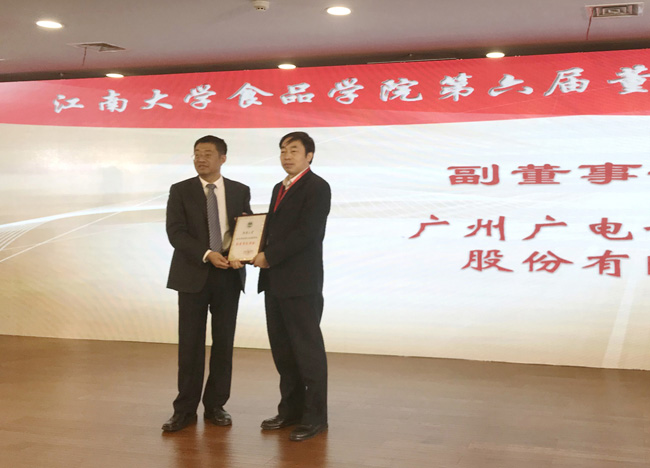 廣電計量總經理黃敦鵬(右一)接受江南大學副校長陳衛授牌,當選為江南大學食品學院第六屆董事會副董事長