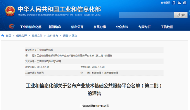 工業和信息化部關于公布產業技術基礎公共服務平臺名單(第二批)的通告