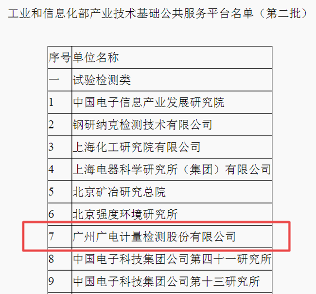 廣電計量列入工業和信息化部產業技術基礎公共服務平臺名單