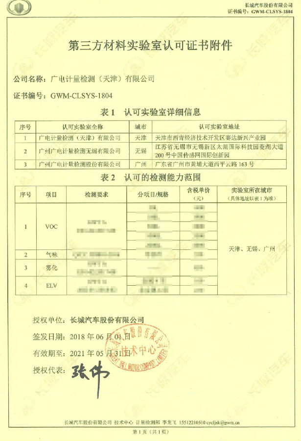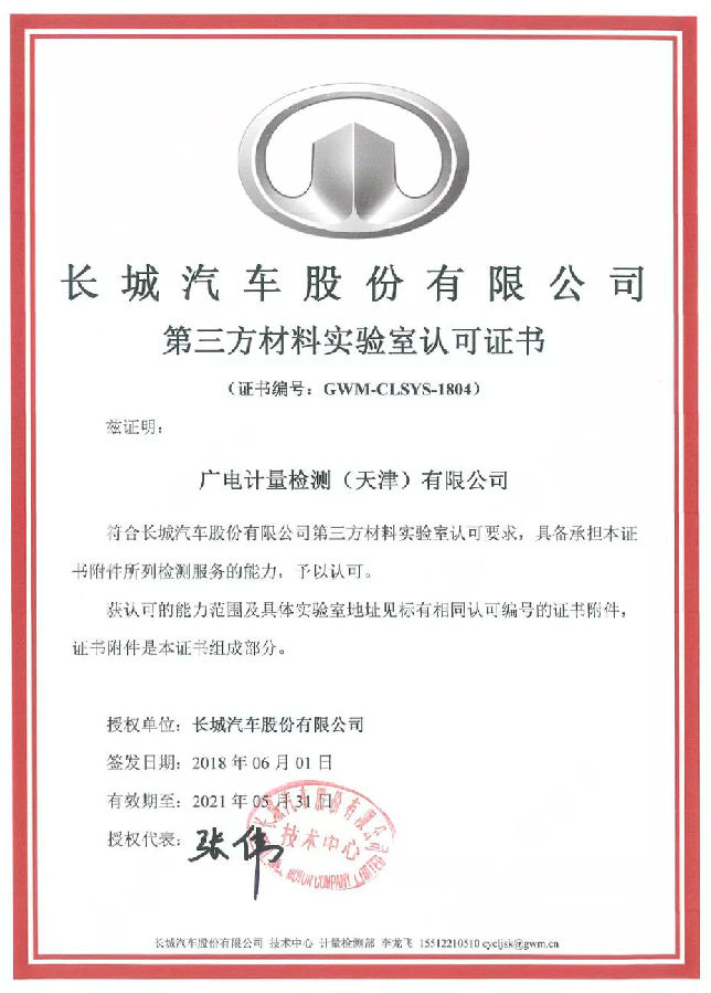 天津、無錫、廣州檢測基地新獲長城汽車第三方材料實驗室認(rèn)可。至此,廣電計量已獲得長城汽車的化學(xué)分析(VOC、ELV、氣味、霧化)、電磁兼容檢測、可靠性與環(huán)境試驗(包括電氣性能)等多項授權(quán)認(rèn)可。