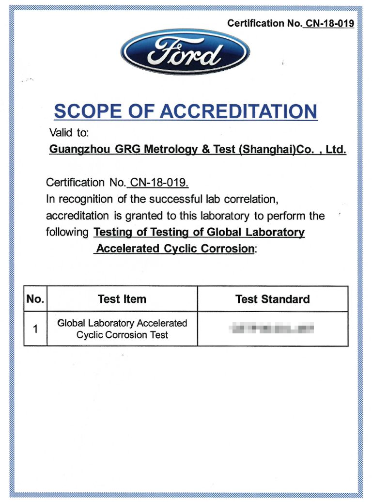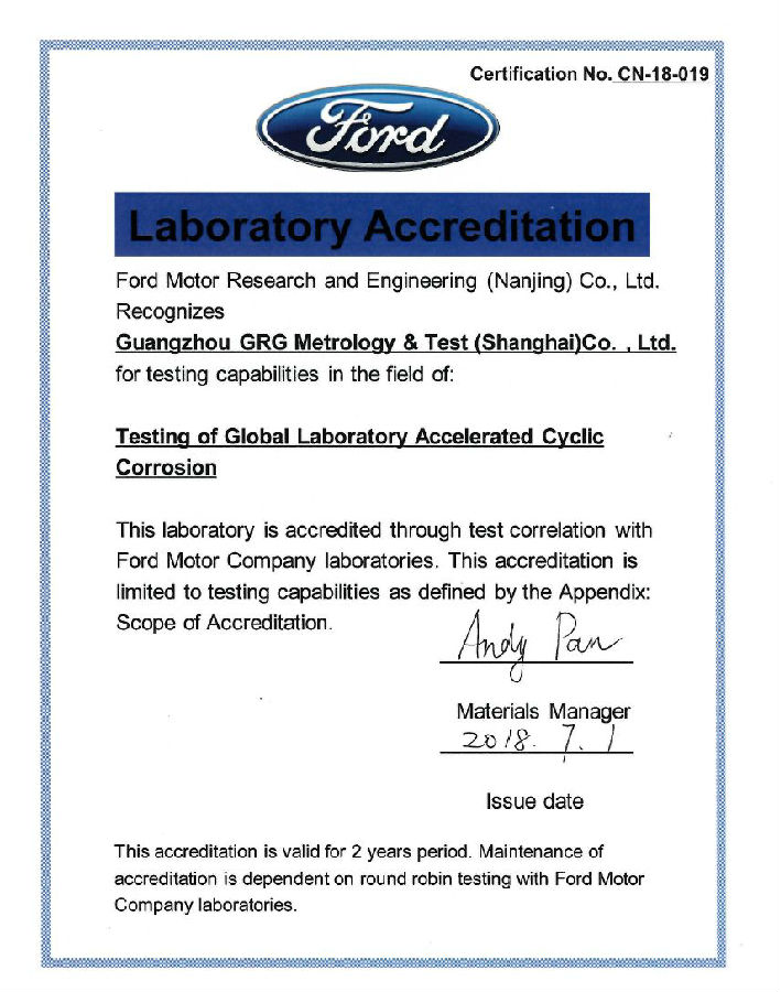 上海檢測基地新獲福特汽車循環(huán)腐蝕試驗第三方實驗室認(rèn)可,今后可承接其供應(yīng)商相關(guān)金屬類部件測試需求。此前,已有無錫檢測基地獲福特汽車第三方實驗室VOC(10L和2000L)認(rèn)可。