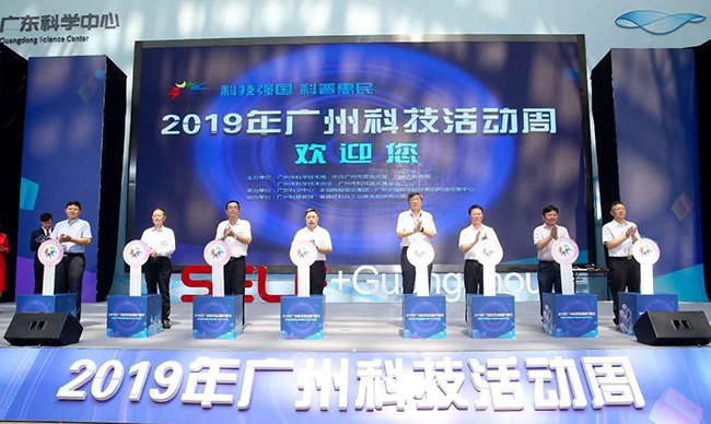 5月19日,2019年廣州科技活動周在廣東科學中心主場館盛大開幕。本次活動由廣州市科學技術局、中共廣州市委宣傳部、廣州市教育局等主辦,開幕儀式融合科學與藝術,邀請中國科學院院士、中國散裂中子源工程指揮部總指揮陳和生,香港大學空間研究實驗室執行主任、著名科學家蘇萌等科技大咖,兩岸及港澳地區科普屆的專家代表,廣州科普聯盟單位以及十多家粵港澳大灣區科技創新企業與公眾共享了一場精彩紛呈科技盛宴。