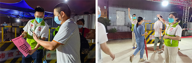在等候區、核對區、登記區、檢查區,“綠馬甲”隨處可見,志愿者們顯得輕車熟路,指引著市民有序排隊進行檢測。這已經是廣電計量團委第三次組織志愿者支援該社區核酸檢測及相關防疫宣傳工作。早在廣州本輪疫情初期,廣電計量團委在公司黨委和集團團委的工作部署下,火速組建了“青年抗疫突擊隊”,緊急支援天河區首輪全員核酸檢測工作。