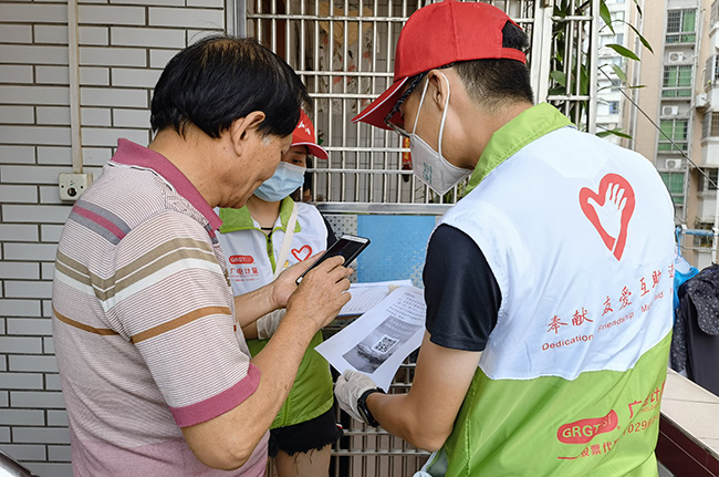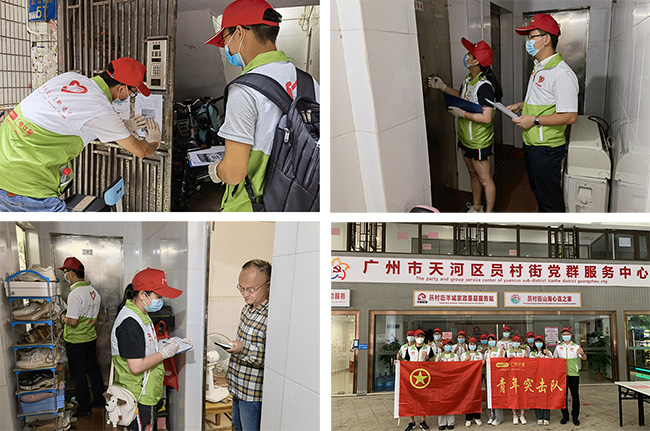 6月5日,青年抗疫突擊隊成員組成小分隊,在居民樓下醒目位置粘貼登記碼,并逐戶敲門為居民登記相關信息。正值盛夏,廣州的最高溫度高達35℃,志愿者們的衣服早已被汗水濕透,但是高溫、悶熱、潮濕、蚊蟲都無法阻擋他們的腳步,依然堅持不漏一戶、不落一人。當天,志愿者們協助完成了員村山頂和天福社區的摸排工作,服務居民近6000人。