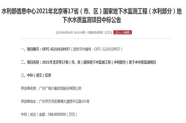 今年6月,國家水利部對2021年北京等17省(市、區)國家地下水監測工程(水利部分)地下水水質監測項目進行公開招標,廣電計量從眾多權威檢測機構中脫穎而出成功中標。