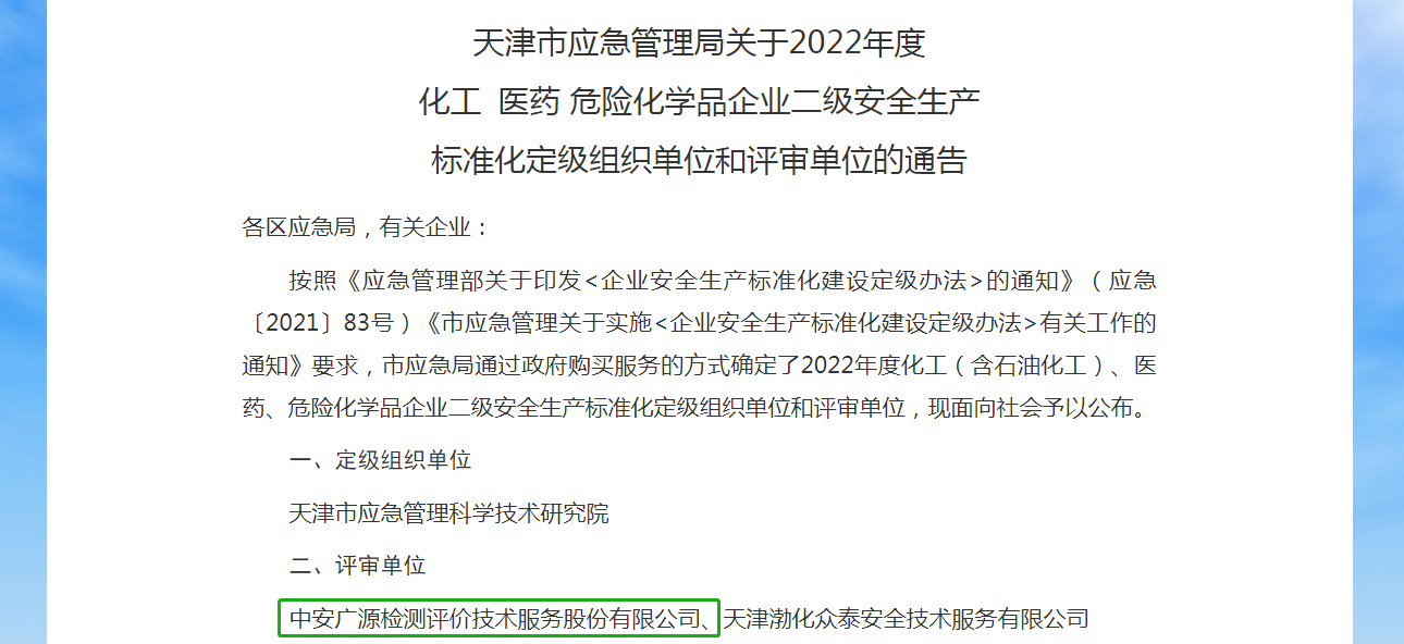 為高標準完成相關標準化創(chuàng)建工作,充分發(fā)揮技術支撐作用,全力做好政府部門和企業(yè)的橋梁,中安廣源作為天津市應急管理局確定的化工、醫(yī)藥 、危險化學品企業(yè)二級安全生產(chǎn)標準化評審單位,在此溫馨提示如下: