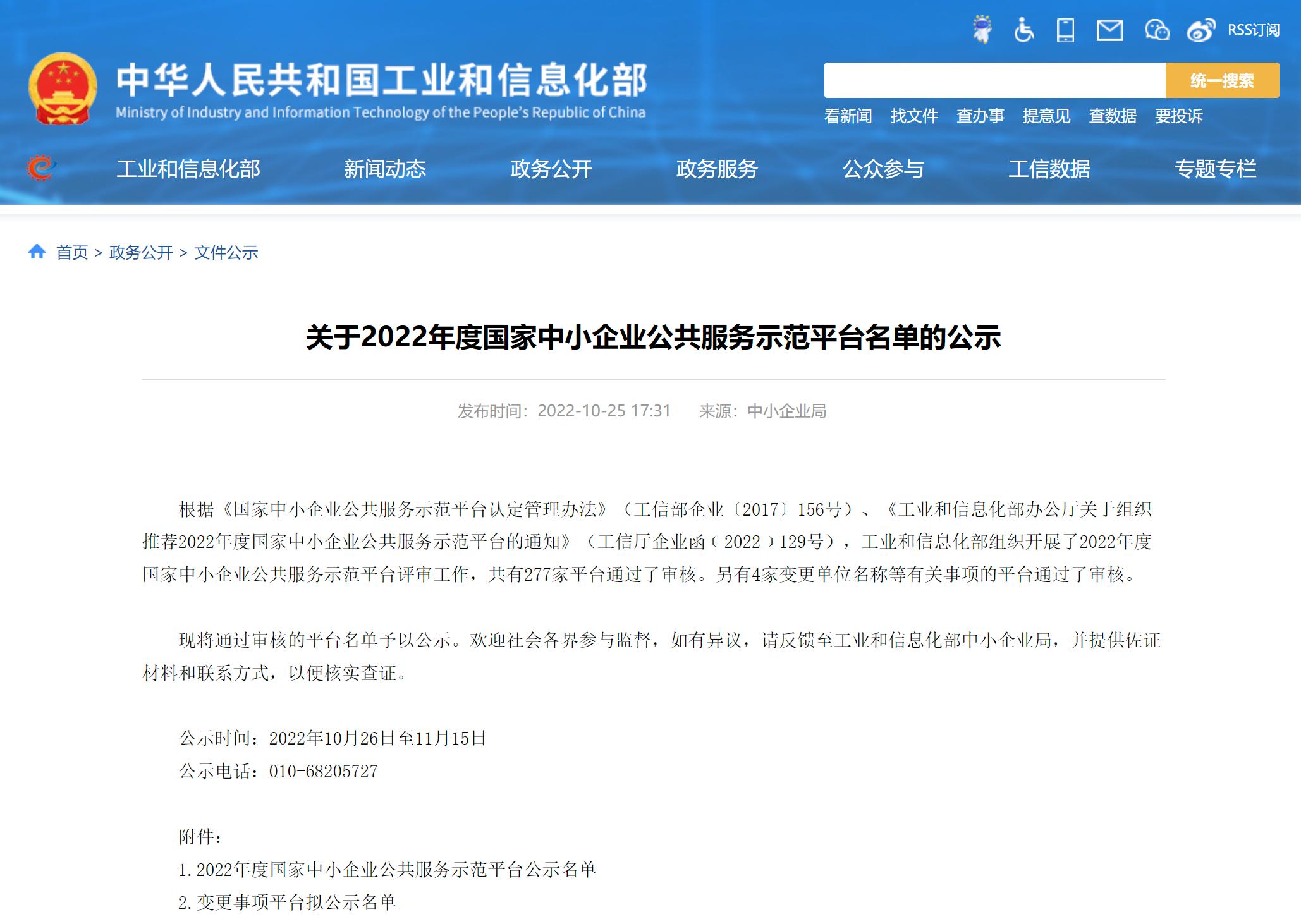 10月25日,根據《國家中小企業公共服務示范平臺認定管理辦法》(工信部企業〔2017〕156號)、《工業和信息化部辦公廳關于組織推薦2022年度國家中小企業公共服務示范平臺的通知》(工信廳企業函﹝2022﹞129號),工業和信息化部組織開展了2022年度國家中小企業公共服務示范平臺評審工作。廣電計量憑借領先的綜合技術服務能力、穩健的業績增長以及較強的公信力,成功獲評國家中小企業公共服務示范平臺,此資質將從即日起延續三年。