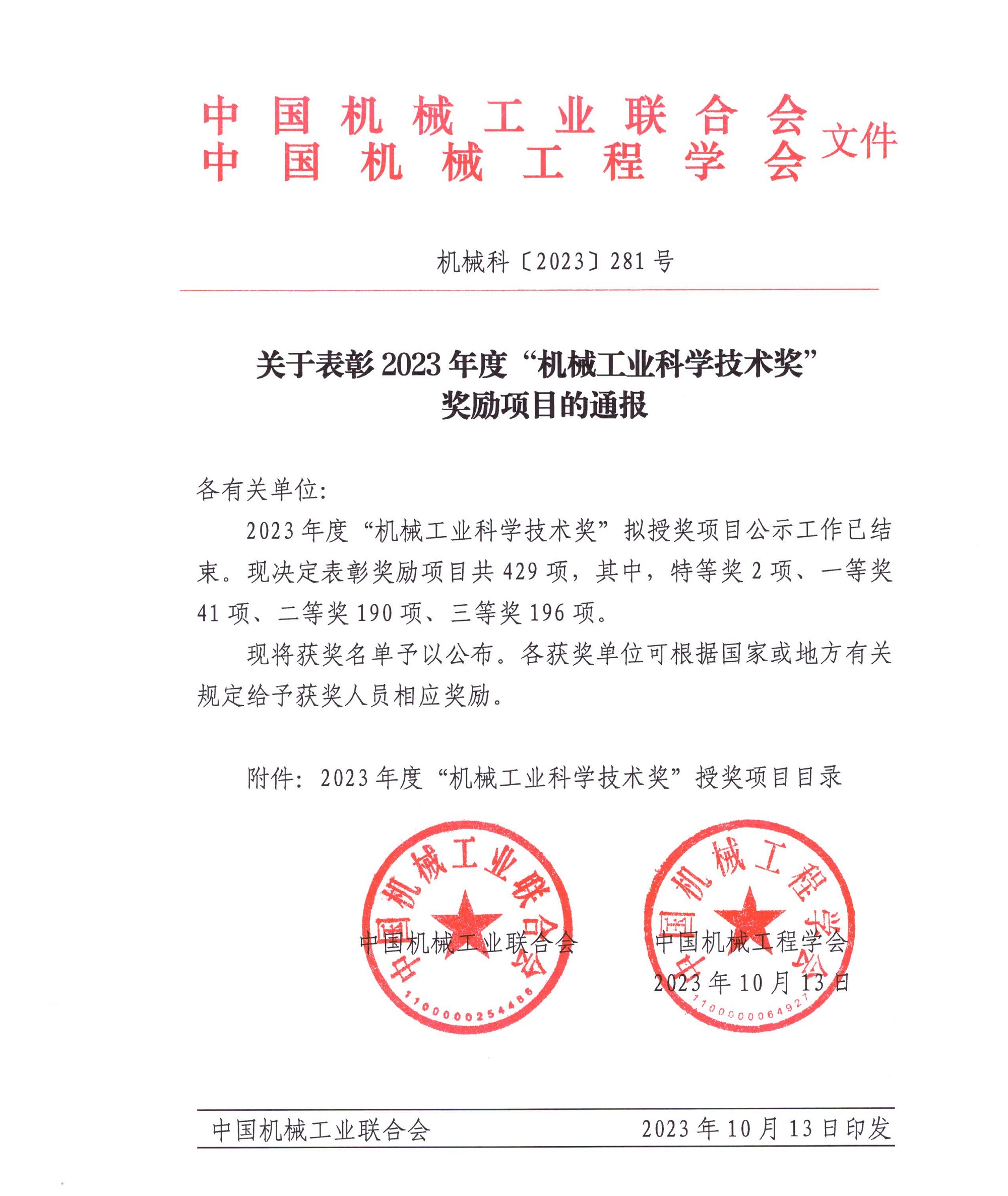 中國機械工業科學技術獎是根據《國家科學技術獎勵條例》和《社會力量設立科學技術獎管理辦法》的有關規定,由中國機械工業聯合會和中國機械工程學會共同設立并經國家科學技術部批準,在國家科技獎勵主管部門登記的面向全國機械行業的綜合性科技獎項,也是機械工業申報國家科技進步獎的主要渠道。