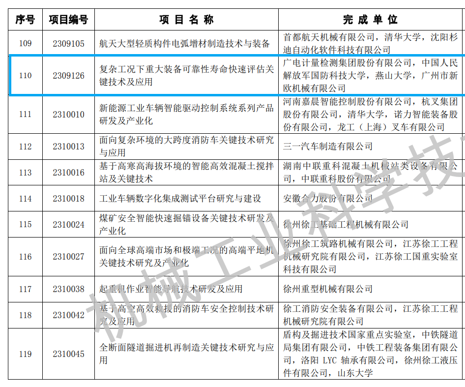 10月13日,2023年度“機械工業科學技術獎”名單公布。經中國機械工業聯合會及中國機械工程學會評審,由廣電計量檢測集團股份有限公司、國防科技大學、燕山大學和廣州市新歐機械有限公司聯合開發的《復雜工況下重大裝備可靠性壽命快速評估關鍵技術及應用》項目獲評2023年度“機械工業科學技術獎”科技進步獎二等獎。