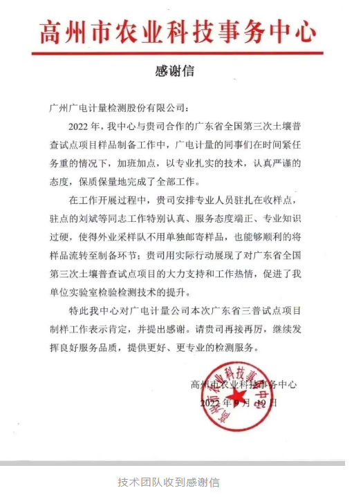 廣電計量已在廣州、長沙、鄭州、南寧、沈陽、成都、南昌、西安、合肥、福州、天津等11個地區(qū)建立生態(tài)環(huán)境檢測實驗室,先后榮獲“南方耕地污染防控企業(yè)重點實驗室”“全國土壤污染狀況詳查檢測實驗室”“耕地質(zhì)量標(biāo)準(zhǔn)化驗室”等項目承接資質(zhì)榮譽;截至2022年7月11日,廣電計量已有10家實驗室全部入圍《第三次全國土壤普查檢測實驗室公示名單》;長沙、合肥實驗室成功?圍本省第三次全國土壤普查外業(yè)調(diào)查與采樣單位名單。