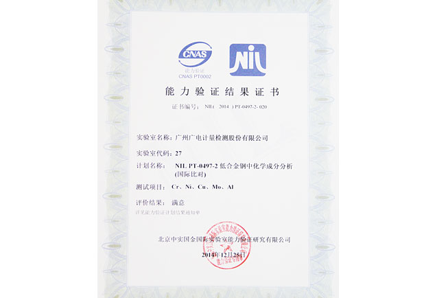 GRGT近期收到北京中實國金國際實驗室能力驗證研究有限公司關于“NIL PT-0497-2 低合金鋼中化學成分分析(國際比對)”能力驗證計劃結果通知單,結果顯示我司化學分析測試中心以優異成績通過本次能力驗證。