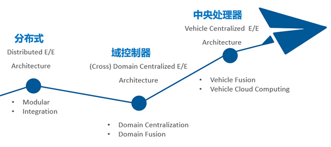全球最大汽車零部件制造商博世認(rèn)為,電子電氣架構(gòu)將依次經(jīng)歷傳統(tǒng)的分布式、域控制器、中央處理器三個(gè)階段的逐漸發(fā)展。從各個(gè)模塊相互獨(dú)立,到功能集成,再到域控制器,再到中央控制器,最終到達(dá)云計(jì)算。