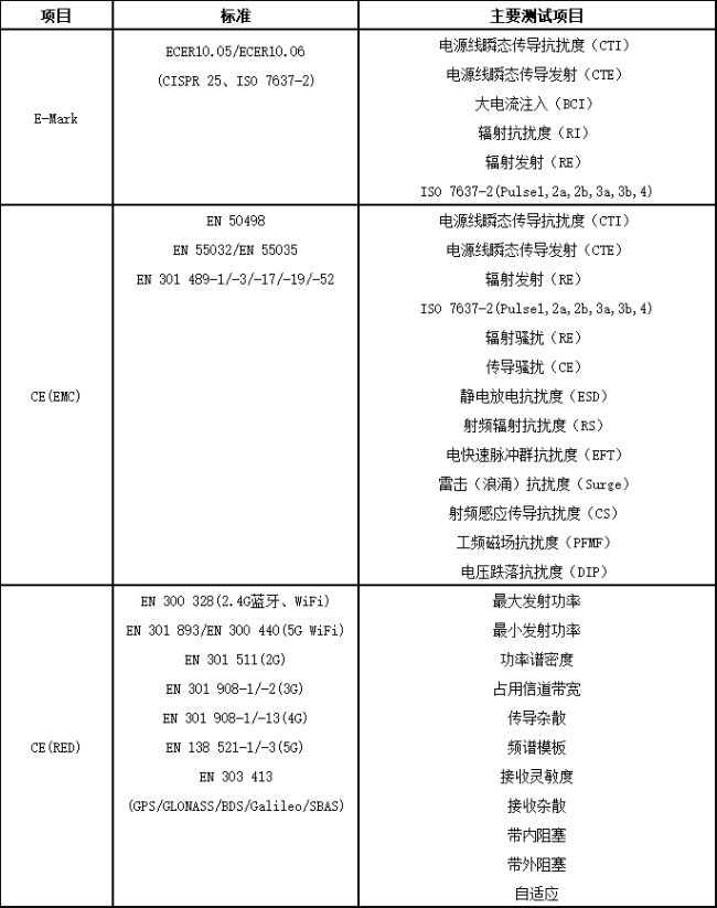 由于車載無線產品功能復雜,涉及多個不同領域的標準,產品需同時滿足不同領域的標準要求,包括E-Mark、CE EMC、CE RED等,對于各廠商來說,如何尋找同時具備相關標準各項目檢測能力(例如5G射頻、7637等)的第三方服務機構是其面臨的主要難點。