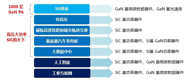 第三代半導體在新基建七大領域都有其廣泛的應用前景。在5G基站領域, GaN PA(即氮化鎵功率放大器)是5G基站的最優選擇,預計在2025年前,我國 5G 宏基站預計將建設超過500萬站,而5G宏基站、微基站、及毫米波基站帶來的GaN PA 市場規模將超過1000億元,而特高壓、高鐵和軌交、充電樁、大數據中心等高壓大功率領域都將是SiC的天下。