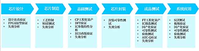 其中,仿真驗證一般由芯片設計公司在tapeout前完成,WAT一般是芯片制造出廠前由foundry自行完成。Wafer out之后進入工程化量產或篩選測試階段,CP、FT和SLT一般由第三方代工服務。期間伴隨多樣的測試技術也由第三方服務,包括驗證分析技術、可靠性測試、失效分析技術和認證技術。