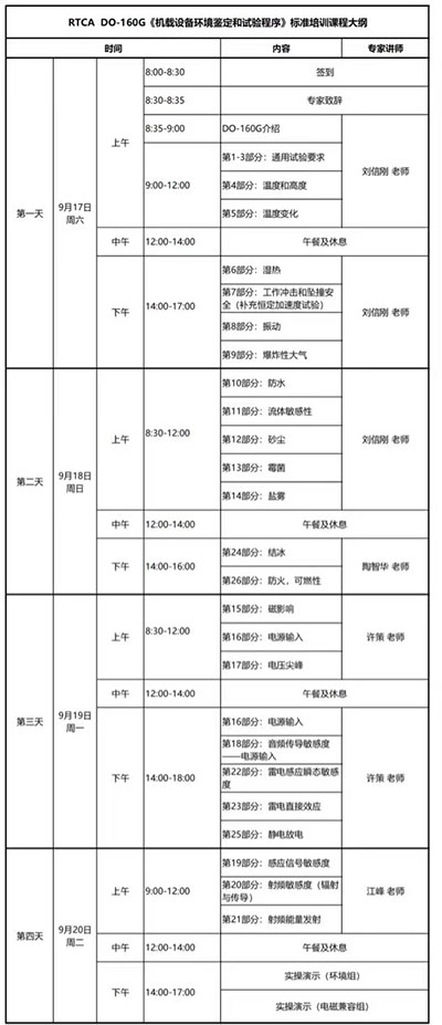 《機載設備環境條件和試驗程序》全部試驗原理及方法,包括通用實驗要求:溫度、高度、溫度變化、濕熱、沖擊、振動、爆炸性大氣、防水、流體敏感性、砂塵、霉菌、鹽霧、結冰、防火、電源輸入、電壓尖峰、音頻傳到、感應信號、射頻敏感度、射頻能量發射、雷電感應、雷電直接效應、磁影響、靜電放電共26部分。(涵蓋環境及電源特性,EMC二個測試技術領域),詳見課程大綱如下: