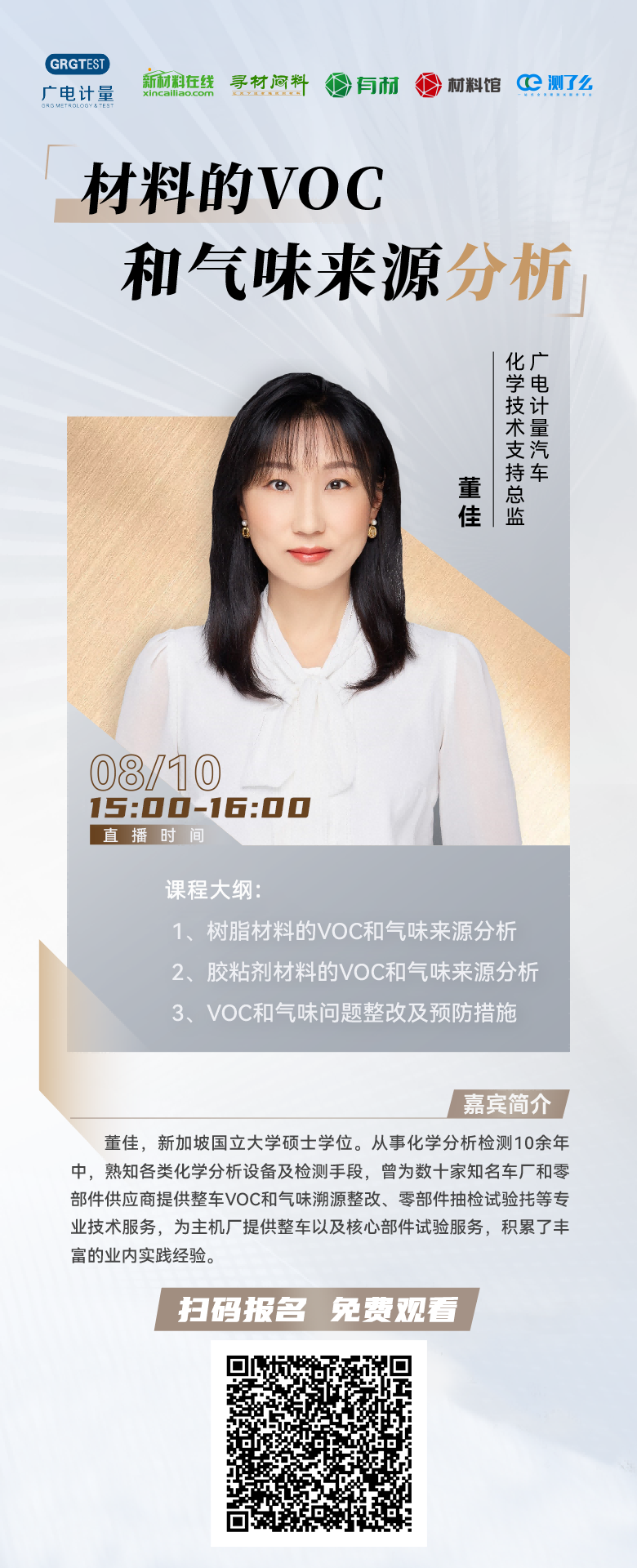 VOC(揮發(fā)性有機物)和氣味污染主要來源于產(chǎn)品生產(chǎn)過程中的原材料和添加劑,這些原料會釋放出一定量甲醛、乙醛、甲苯等有害氣體和物質(zhì)。VOC含量一旦超標(biāo),不僅會產(chǎn)生難聞的氣味,還會對消費者的身體健康造成危害。在材料研發(fā)和生產(chǎn)過程中做好材料的VOC測試和氣味溯源分析,有利于實現(xiàn)綠色材料升級,獲得更廣泛的市場認可。為此,廣電計量與尋材問料將聯(lián)合舉辦《材料的VOC和氣味來源分析》線上公開課,為企業(yè)提供材料VOC和氣味問題的整改及預(yù)防建議,邀您參與觀看。