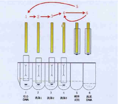 核酸提取儀(磁珠法)基本原理是:通過細胞裂解液裂解細胞,從細胞中游離出來的核酸分子被特異的吸附到磁性顆粒表面,而蛋白質等雜質不被吸附而留在溶液中。反應一定時間之后,在磁場作用下,使磁性顆粒與液體分開,回收顆粒(即磁珠-DNA混合物),再用洗脫液洗脫即可以得到純凈的DNA。