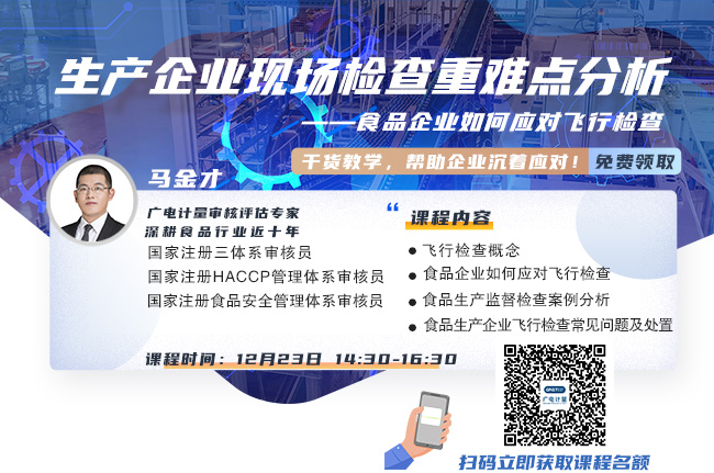 為助力質量強國建設,提升食品行業現場管理水平,強化質量管理要求,廣電計量特邀請國家食品生產管理體系審核員、HACCP審核員 馬金才老師給大家講授《生產企業現場檢查重難點分析——食品企業如何應對飛行檢查》公開課課程,詳細講解食品生產企業生產監督檢查依據、監督檢查要點、飛行檢查常見問題及整改措施,協助相關企業優化管理,提高管理水平,降低質量風險。