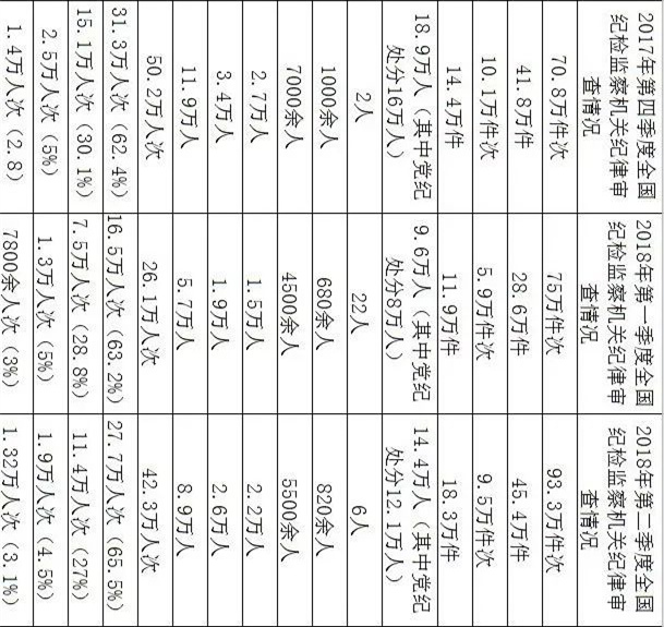 2018年上半年,全國紀檢監察機關共接受信訪舉報168.3萬件次,處置問題線索74萬件,談話函詢15.4萬件次,立案30.2萬件,處分24萬人(其中黨紀處分20.1萬人)。處分省部級及以上干部28人,廳局級干部1500余人,縣處級干部1萬人,鄉科級干部3.7萬人,一般干部4.5萬人,農村、企業等其他人員14.6萬人。2018年上半年,全國紀檢監察機關運用監督執紀“四種形態”處理68.4萬人次。