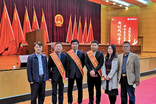 嚴宇兵(左三)獲得武漢市洪山區“優秀勞動者”榮譽稱號
