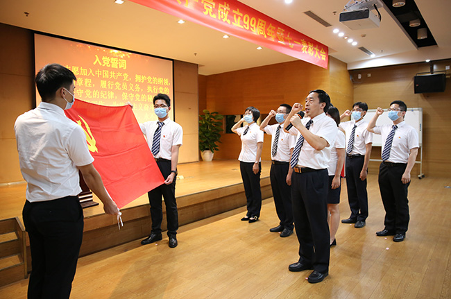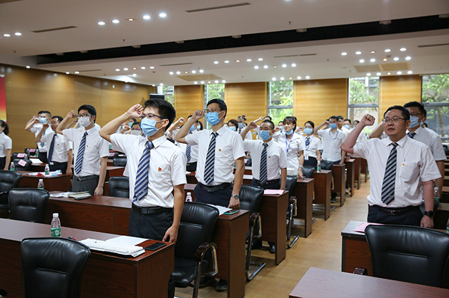 大會在莊嚴雄壯的國歌聲中拉開序幕。首先進行的是新黨員集體宣誓、全體黨員重溫入黨誓詞儀式,由公司黨委書記、總經理黃敦鵬領誓,15名新黨員和全體黨員分別在廣州總部主會場和省外子公司分會場面向黨旗,舉起右手莊嚴宣誓,以飽滿的激情和聲音傳達出了身為共產黨員的自豪感和使命感,進一步堅定理想信念,在工作實踐中彰顯黨員本色。