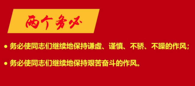 習(xí)近平總書記強(qiáng)調(diào):“對毛澤東同志提出‘兩個(gè)務(wù)必’的深邃思想和戰(zhàn)略考慮,我們要不斷學(xué)習(xí)領(lǐng)會。我們要不斷向全黨嚴(yán)肅鄭重地提出這個(gè)問題,始終做到謙虛謹(jǐn)慎、艱苦奮斗,使我們的黨永遠(yuǎn)不變質(zhì)、我們的紅色江山永遠(yuǎn)不變色。”牢記是為了更好出發(fā)。只有始終牢記全心全意為人民服務(wù)的宗旨,才能始終同人民風(fēng)雨同舟、領(lǐng)航中國號巨輪破浪前行;只有保持謙虛、謹(jǐn)慎、不驕、不躁的作風(fēng),只有保持艱苦奮斗的作風(fēng),才能始終同人民密切聯(lián)系在一起,在這場歷史性考試中經(jīng)受考驗(yàn),不斷向歷史、向人民交出新的更加優(yōu)異的答卷。