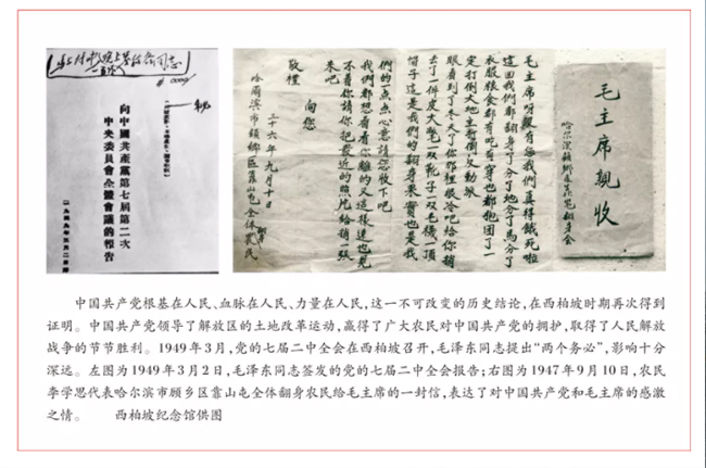 ——彰顯為了人民、依靠人民的人民情懷。中國共產黨根基在人民、血脈在人民、力量在人民。展覽中展示了這樣一封書信,信中寫道:“毛主席呀,沒有您我們真得餓死啦。這回我們都翻身了,分了地,分了馬,分了衣服、糧食,都有吃有穿,也都抱團了……”這封信是東北翻身農民寫給毛主席的,已經成為我們黨一切為了人民、一切依靠人民的歷史見證。全國土地會議景觀、參加全國土地會議的部分人員名單、部分代表在土地會議上的發言稿、老農民在土墻上書寫的《中國土地法大綱》照片、“土地回老家”錦旗……眾多展品生動詮釋了黨在西柏坡的歷史,就是全心全意為人民服務的歷史。支前民工的立功喜報,用過的推車、紡線車,“運糧先鋒”的獎旗……人民群眾踴躍參軍參戰、繳糧支前,為人民軍隊提供了源源不斷的人力物力,大大加快了解放戰爭勝利和新中國建立的步伐。黨為了人民、依靠人民的文物、史料和真實記錄,可以啟迪干部群眾深切感受到,黨始終堅持全心全意為人民服務的根本宗旨,人民群眾的擁護和支持是我們黨最堅實的根基。