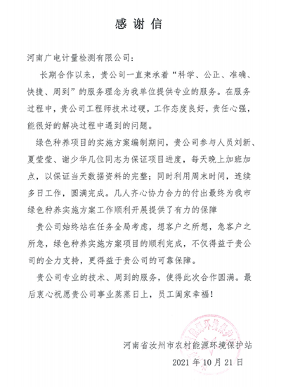 在汝州項(xiàng)目保障期間,時(shí)間緊,任務(wù)重,天氣突變,而劉新前一天晚上堅(jiān)持工作到凌晨3點(diǎn),第二天清早又趕到客戶辦公室,最終體力不支病倒了,團(tuán)隊(duì)的同事們紛紛送上關(guān)切的問候,讓她回去休息,但劉新仍然堅(jiān)持留在工作現(xiàn)場做好技術(shù)指導(dǎo)與工作協(xié)調(diào),她的拼勁為團(tuán)隊(duì)注入強(qiáng)大的精神動(dòng)力,大家一起堅(jiān)守趕制完成報(bào)告,團(tuán)隊(duì)又連夜從汝州趕回鄭州,陪同客戶如期將報(bào)告提交到政府主管部門。最終,試點(diǎn)實(shí)施方案順利通過,廣電計(jì)量的綜合能力獲得認(rèn)可,并收到了客戶表揚(yáng)信。