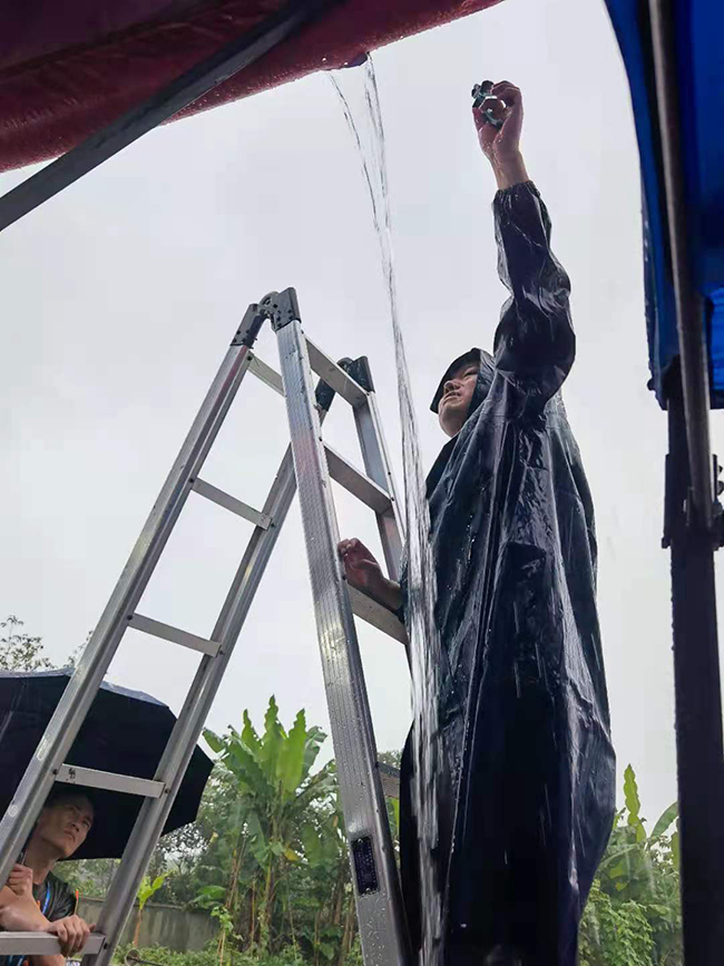 黨員同志冒雨搶修試驗現場的工棚