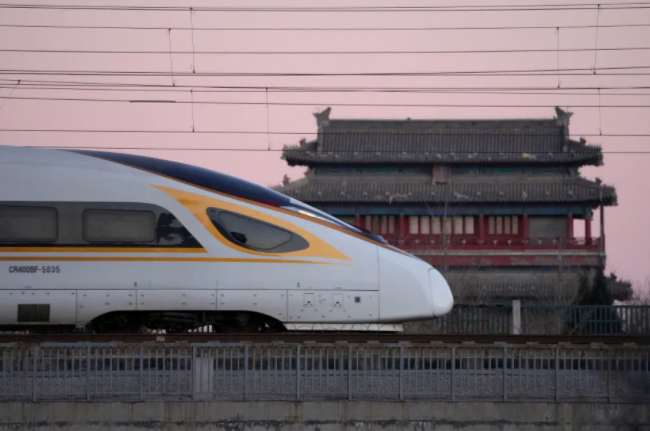 1月17日清晨,一列動車組列車駛過北京永定門城樓。新華社記者 邢廣利 攝