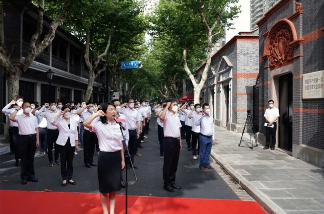 這是7月1日,上海市新黨員代表入黨宣誓活動(dòng)在中共一大會(huì)址前舉行。當(dāng)日,中共一大紀(jì)念館舉辦多種教育活動(dòng),慶祝中國(guó)共產(chǎn)黨成立101周年。新華社記者劉穎 攝