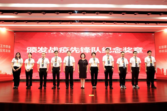梁玉琴(左六)與黃敦鵬(左五)為公司戰(zhàn)疫先鋒隊(duì)代表頒發(fā)紀(jì)念獎(jiǎng)?wù)?/p>