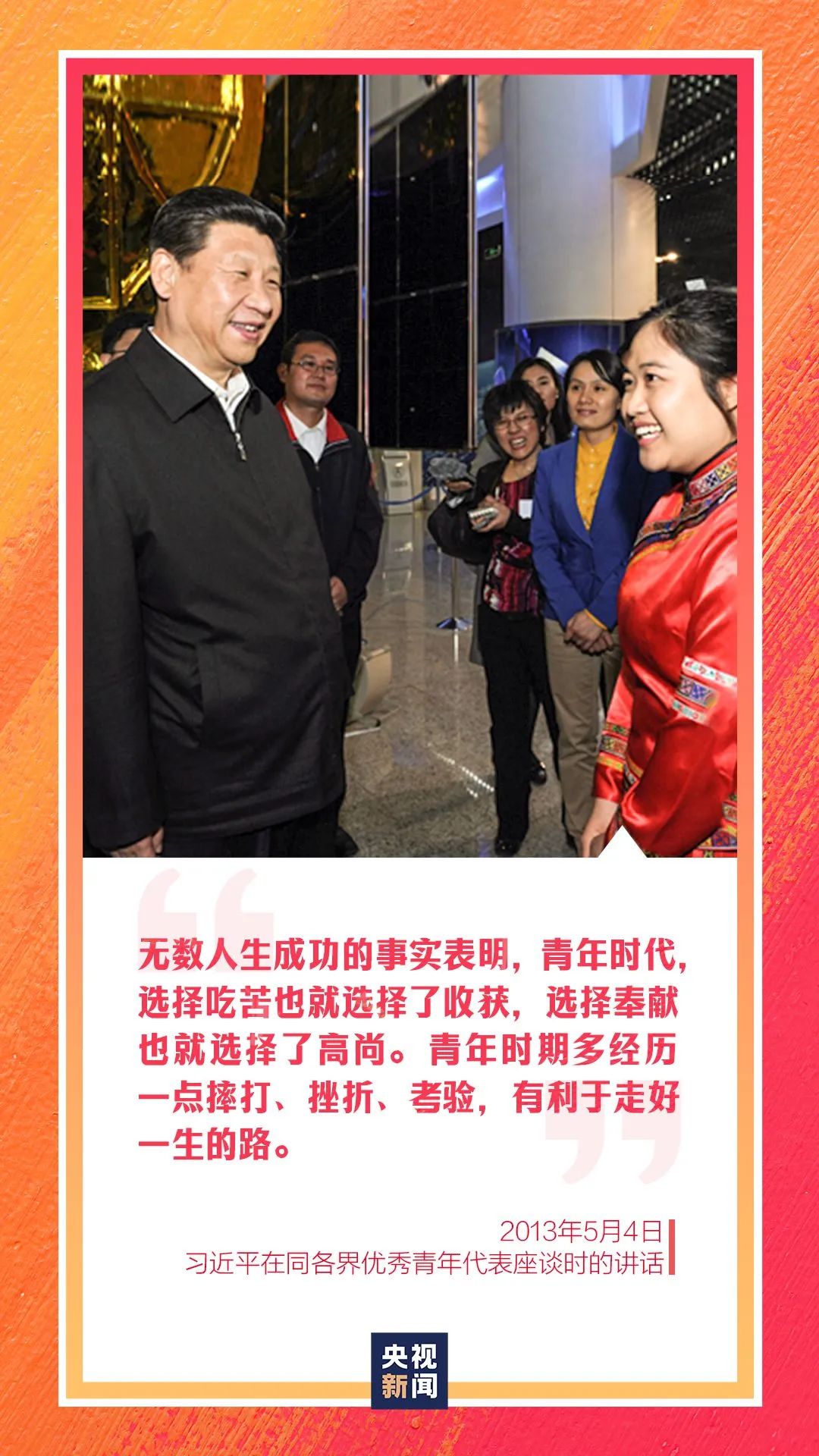 2013年5月4日,習近平總書記在同各界優秀青年代表座談時曾說:“無數人生成功的事實表明,青年時代,選擇吃苦也就選擇了收獲,選擇奉獻也就選擇了高尚。青年時期多經歷一點摔打、挫折、考驗,有利于走好一生的路。”