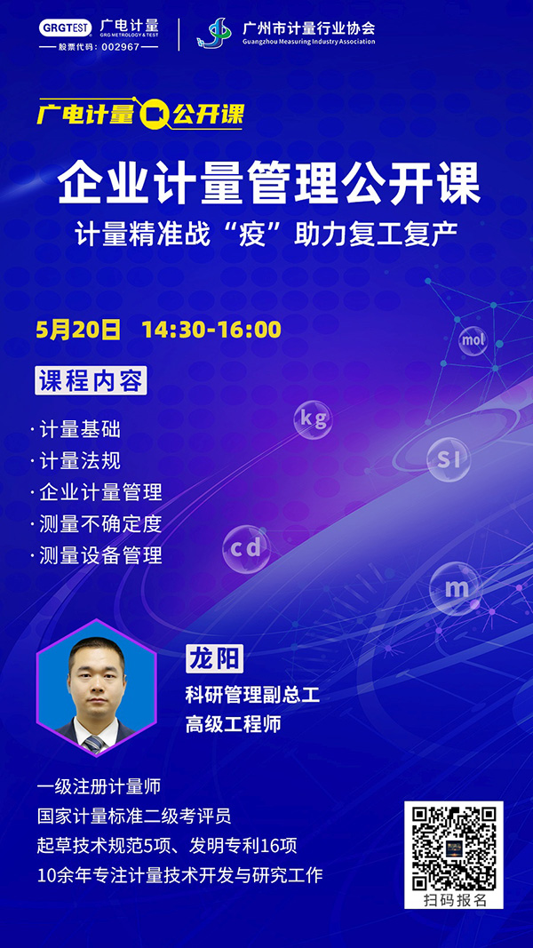 5月20日(本周三14:30-16:00),廣電計量高級工程師龍陽為您帶來企業計量管理公開課,助力企業復工復產,歡迎各位朋友掃碼報名!